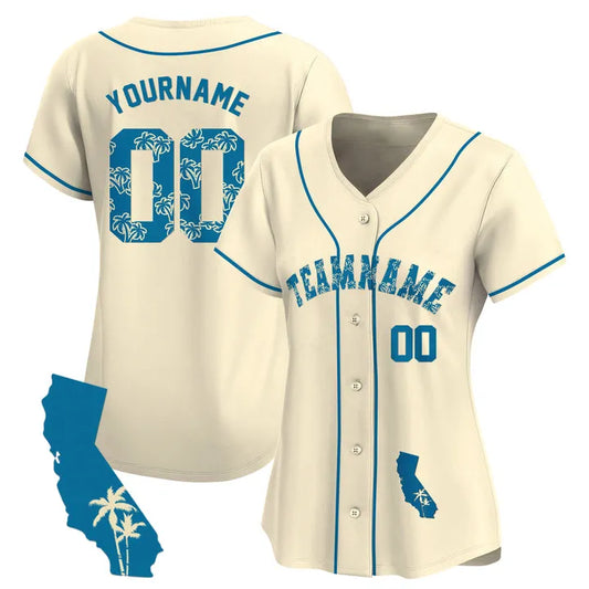 CUSTOM CREAM BLUE PALM TREES CALIFORNIA MAP BASEBALL JERSEY - EMBROIDERED