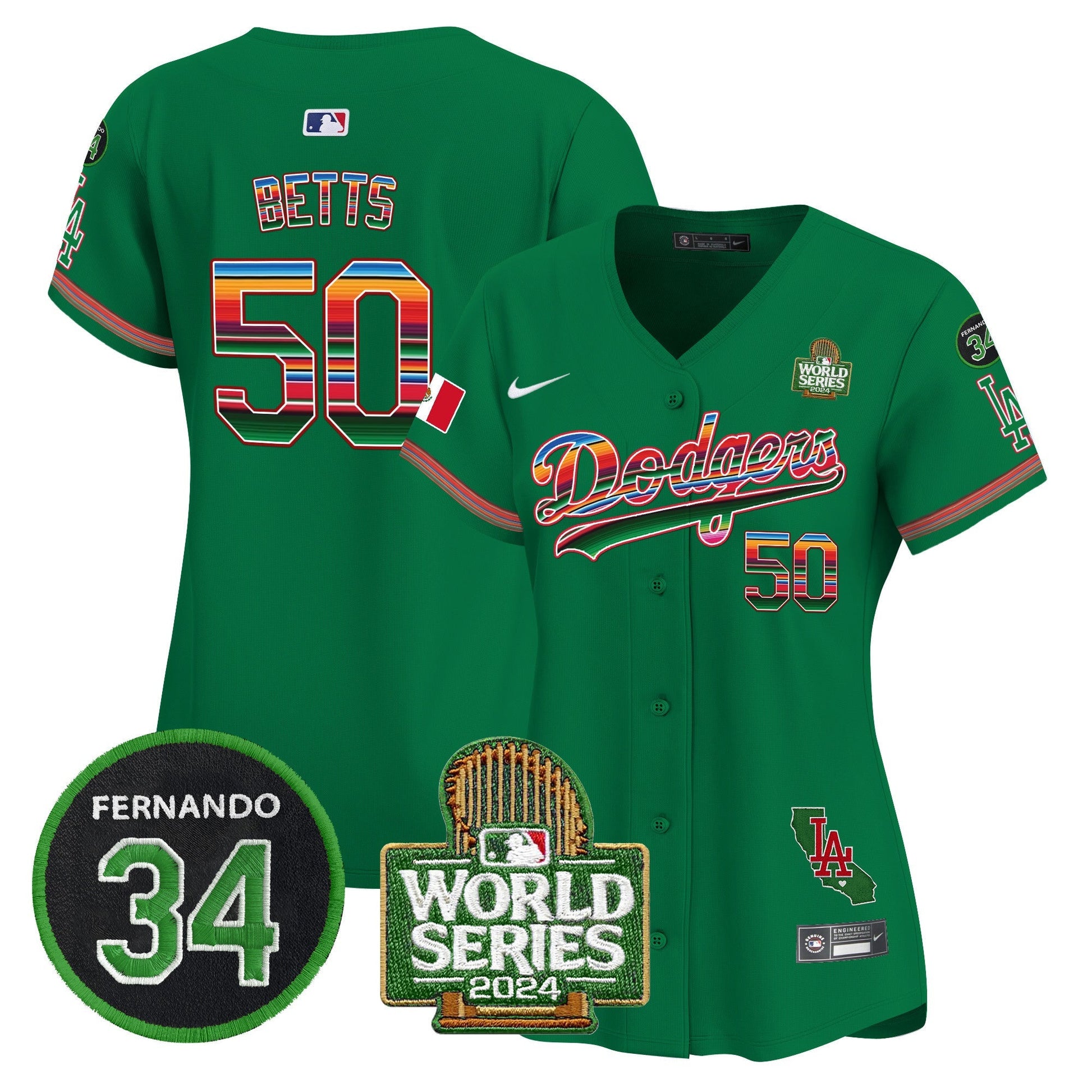Women's Dodgers Mexico Fernando Memorial & 2024 World Series Patch Vapor Premier Limited Jersey V2 - All Stitched